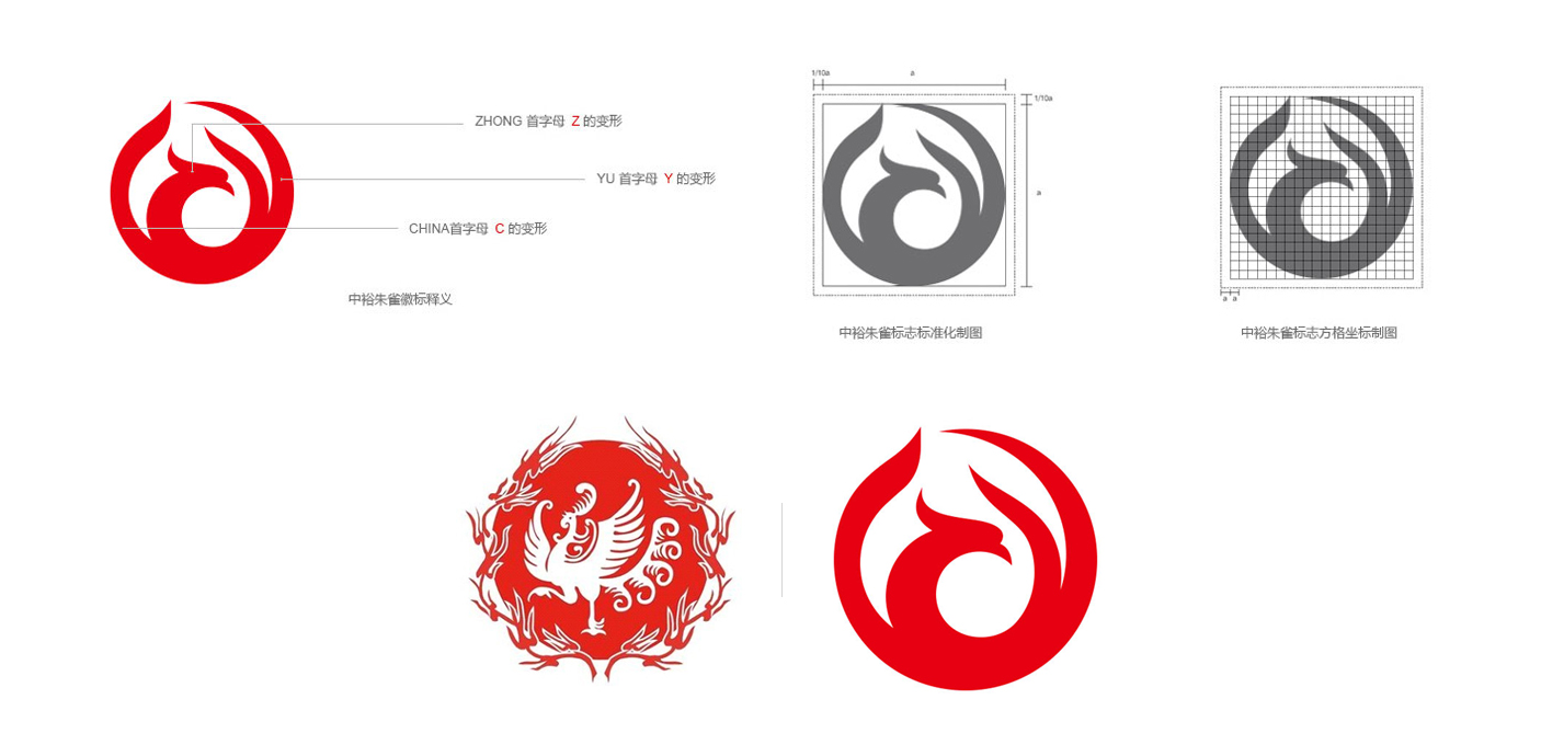 基本概念: 依然借助“朱雀是太陽鳥、火鳳凰、日精,是中國四大靈獸之一,是太陽的化身”的傳統文化內涵。取其掌控能源、服務大眾、安全、恒久、吉祥、生生不息之涵義,與中裕行業性質和企業文化相吻合。