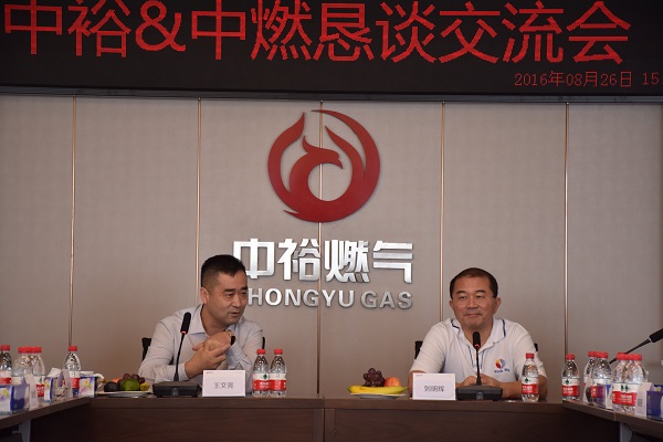 當天,中國燃氣劉明輝主席一行首先在王文亮主席及集團管理層的陪同下,參觀了集團本部新址。接著,雙方在多功能廳召開“兄弟同心,其利斷金——中裕&中燃懇談交流會”,就目前經濟形勢下行業發展面臨的挑戰與機遇進行了探討,同時對集團企業管理進行了深度交流。